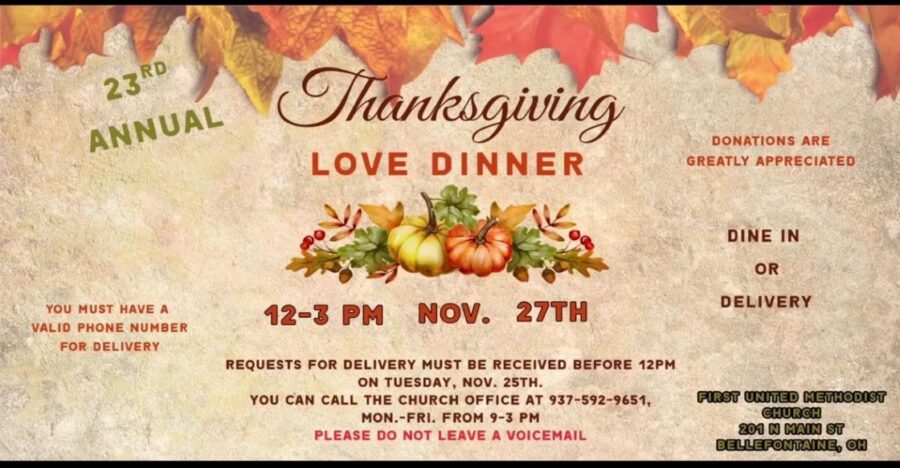 First United Methodist Church, 201 North Main Street, Bellefontaine, will host a Thanksgiving meal on Thursday, November 27 from 12 – 3 pm. Dine in or delivery can be arranged by calling the office at 937-592-9651 (do not leave a message).