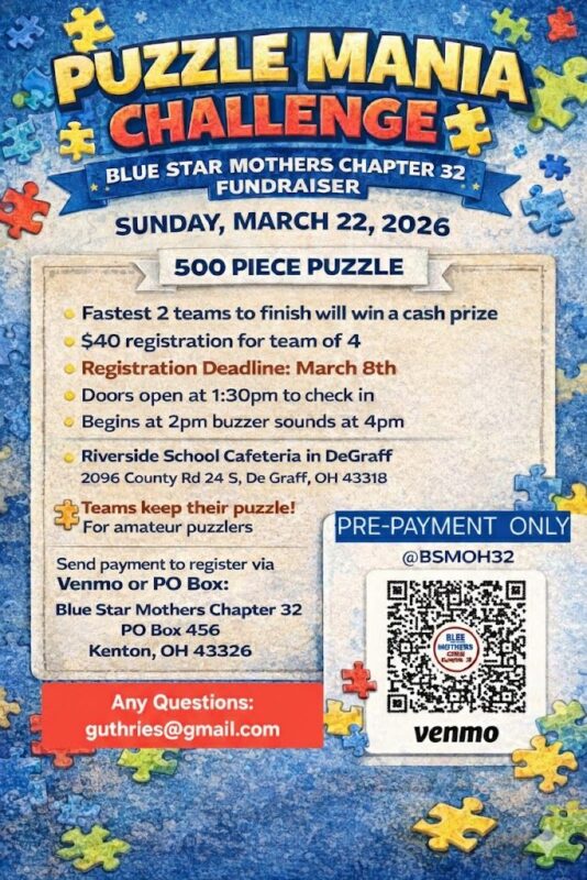 We are thrilled to announce that Blue Star Mothers Chapter 32 is launching some exciting new fundraisers this year, and we’re kicking things off with a brand-new event: PUZZLE MANIA! Are you ready to test your speed and teamwork? Grab your friends, family, or fellow puzzle lovers and join us for our first-ever puzzle competition! It’s going to be a fun-filled afternoon for a great cause. Registration Deadline March 8th, 2026- Venmo @BSMOH32 or Mail to register Blue Star Mothers- P.O. Box 456 Kenton Ohio 43326