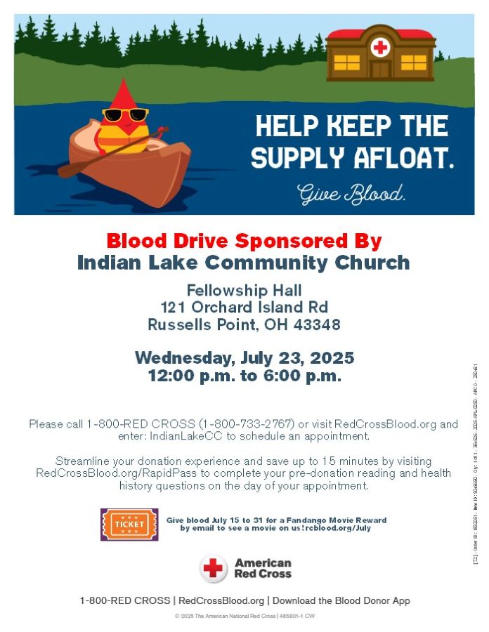 Indian Lake Community Church/The Lighthouse at Indian Lake is hosting a Blood Drive on July 23, 2025, from noon to 6 PM.