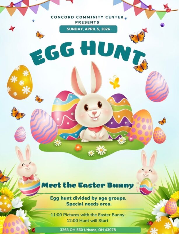HomeEventsConcord Community Center Egg Hunt Concord Community Center Egg Hunt SHARE NOW Sun, Apr 5 from 11:00am to 1:00pm Concord Community Center 3263 OH 560 Urbana, Ohio 43078 Map Add to My Calendar
