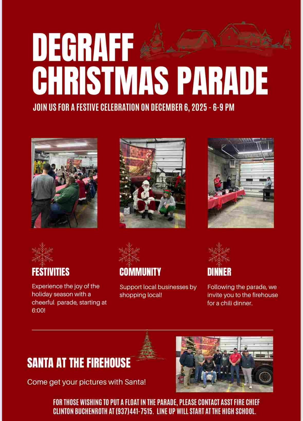 Come celebrate the season at the DeGraff Fire Department’s Hometown Christmas Parade! After the parade, keep the fun going immediately afterward with a warm chili and hotdog dinner at the firehouse, 117 South Main Street, DeGraff. Plus—Santa himself will be there for photos! Don’t miss this festive hometown tradition from 6 – 9 pm.