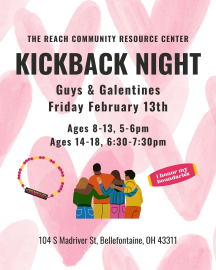 The Reach’s February Kickback Night is a Valentine’s Day, friendship-themed craft and activity. We will decorate cookies and crafts, play games, and talk about healthy friendships, boundaries, and red vs. green flags. This event is designed for ages 8-18. This event is free and open to all Logan County youth. Parents are welcome to stay or drop off. Registration is encouraged but not required.