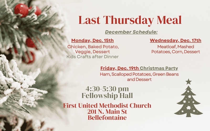 Join us for 3 dinners this month. Monday, Dec. 15th, Wednesday, Dec 17th, and Friday, December 19th from 4:30-5:30 pm in the Fellowship Hall. Monday night, we will have a kids’ craft project after the meal, and Friday is our Christmas Party! Join us for food, fun, and fellowship.