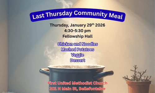 We invite you to join us on Thursday, January 29th, at the First United Methodist Church, 201 North Main Street, Bellefontaine from 4:30-5:30 pm in the Fellowship Hall for our Free Community Meal!