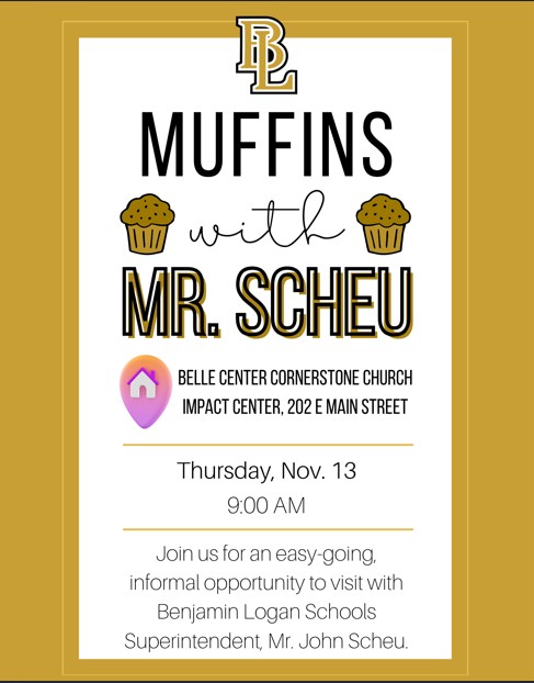 Community members are invited to join Benjamin Logan Schools Superintendent John Scheu for an informal “Let’s Talk School” conversation on Thursday, November 13, at 9 a.m. at the Belle Center Cornerstone Church, 202 East Main Street, Belle Center, Ohio. Coffee, muffins, and donuts will be served.