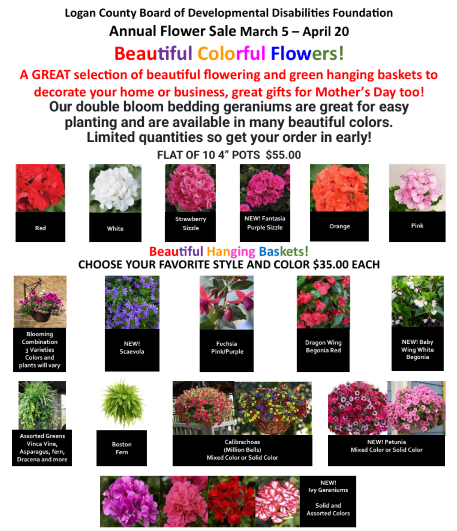 Spring is in the Air. I love feeling warmer weather, sunshine and hearing the birds sing. Hope you do to! Our annual flower sale is here, just in time, so be sure to stock up today. Great Mother’s Day gifts, beautiful flowers for your home and office. Support Logan County Board of Developmental Disabilities Foundation today and you will support all those in our community who need a helping hand and make your home and office beautiful. We appreciate your past support! Call with any questions you may have.
