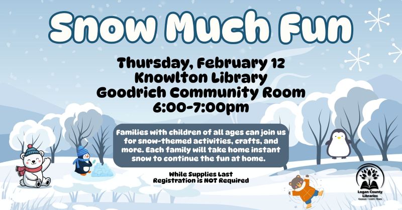Families with children of all ages can come to Knowlton Library on Thursday, February 12 from 6:00-7:00 pm for snow-themed activities, crafts and more. While supplies last. Registration is not required.