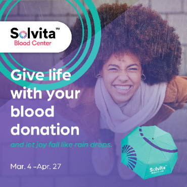 Everyone who registers to donate with Solvita now through April 27 will receive the green and purple Solvita umbrella.