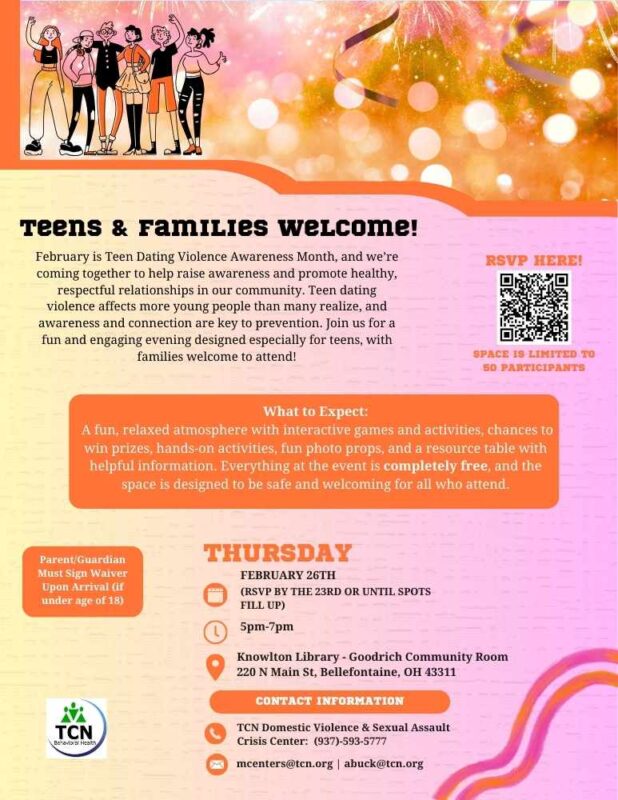 Join us for a Teen Dating Violence Awareness event designed to be informative, interactive, and fun! In recognition of Teen Dating Violence Awareness Month, this event gives teens and families a chance to learn about healthy relationships in a relaxed, welcoming environment.