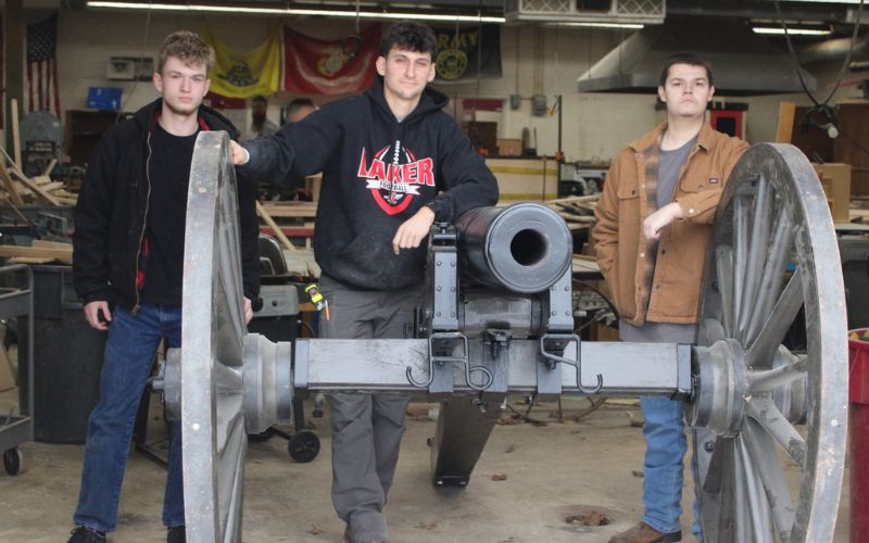 The project was made possible through a partnership between the Armory Foundation and Quest Federal Credit Union, which shared the nearly $7,000 cost of the cannon barrel and wooden wheels. With those pieces secured, ILHS shop and welding students designed and built the wooden carriage, fabricated the metal brackets, and assembled the finished cannon—an 1841 Napoleon six-pounder.