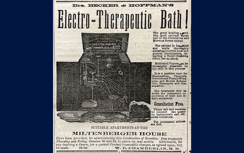 1880 ad from the Logan County Index for an electro-therapeutic bath at the Miltenberger House