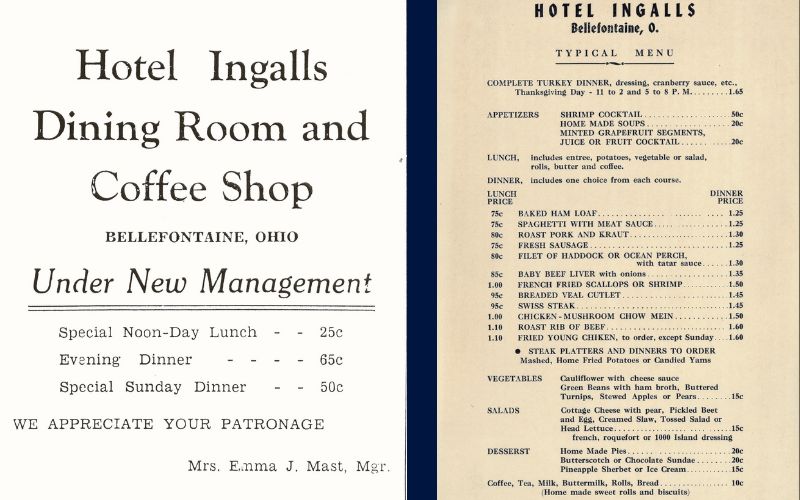 Hotel Ingalls ad from 1932 & Hotel Ingalls Thanksgiving menu from 1944