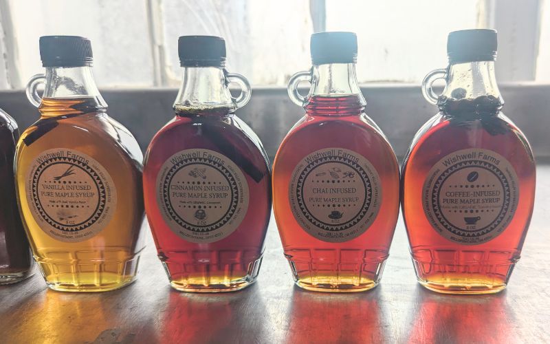 Some of his specialty flavors include coffee, vanilla bean, chai, and cinnamon-infused maple syrup, alongside his traditional, regular option.