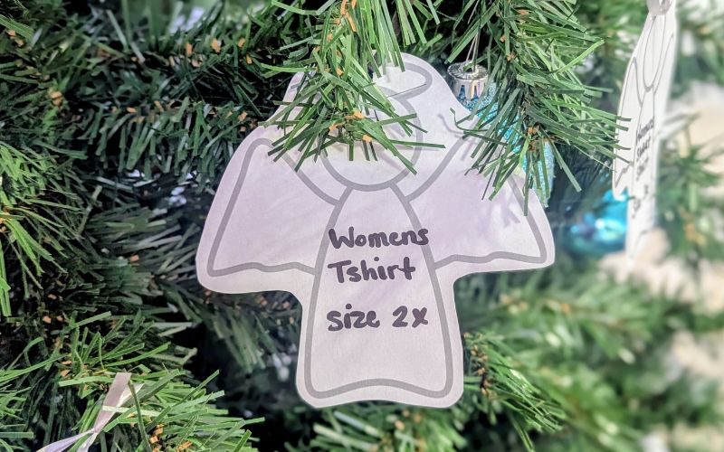 Donation tags listing needed items are available on trees located in the hospital lobby, and donated clothing can be placed in nearby collection bins.