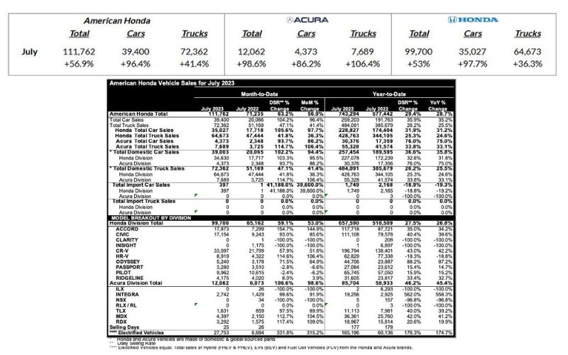 Honda and Acura brands leverage new products to top 111,000 units in July despite continued industry logistics and supply challenges.