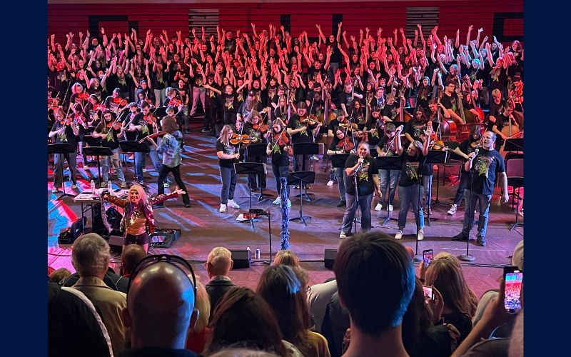 Wood, a Juilliard-trained artist and original string master of the Trans-Siberian Orchestra, and vocalist Kaye led workshops before joining the students for a rock-inspired concert featuring hits like “Living on a Prayer” and “Fight Song.”