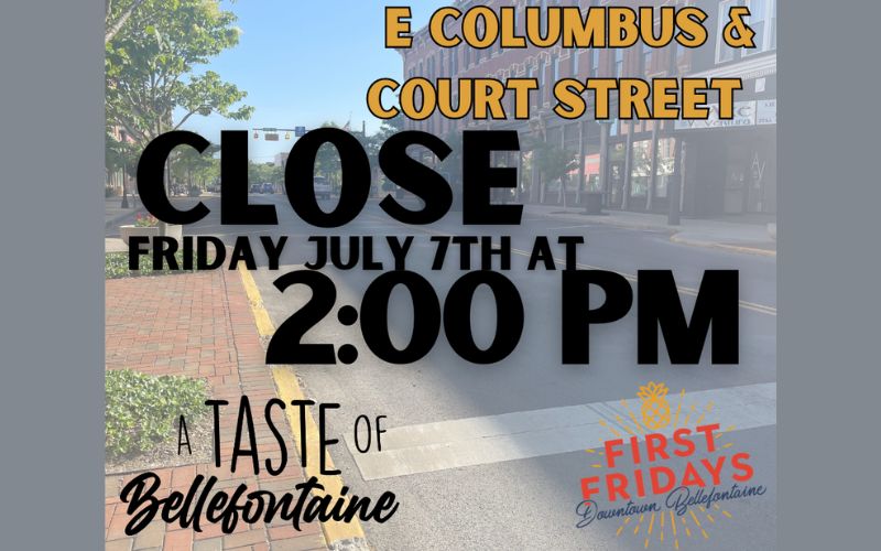The following streets will close on Friday at 2 PM, for Downtown Bellefontaine’s First Fridays event, A Taste of Bellefontaine: