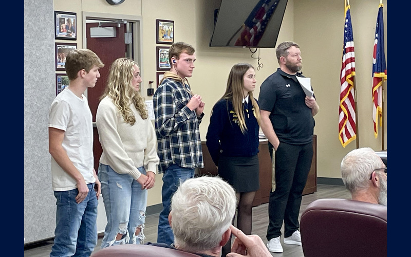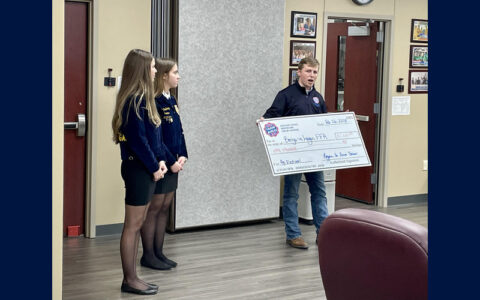 Joel Penhorwood, Jill Smith, and Christina Kneif of the Logan County Farm Bureau presented a $1,000 check to the Benjamin Logan FFA