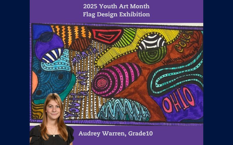 Her submission features a vibrant flag that represents Ohio’s diverse heritage through abstract symbols and motifs.