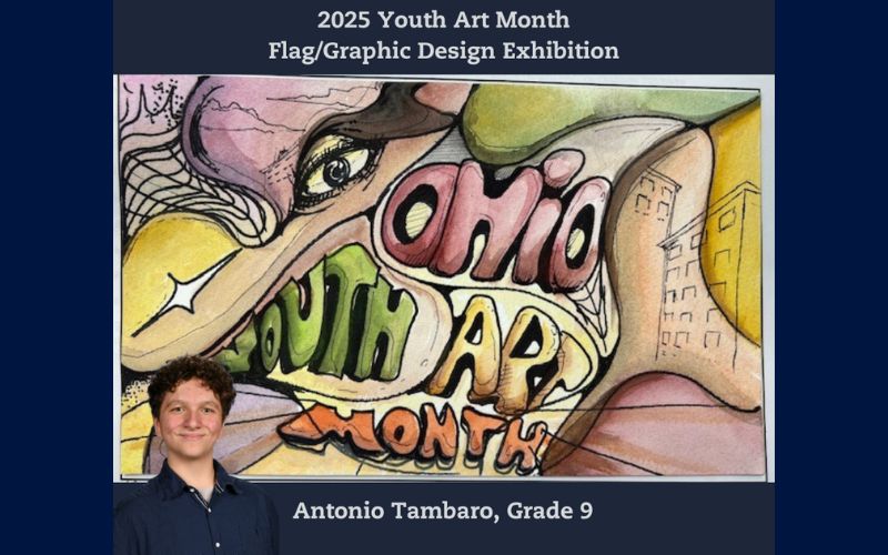 His work effectively merges typography with imagery to capture the essence of Ohio and the spirit of Youth Art Month.