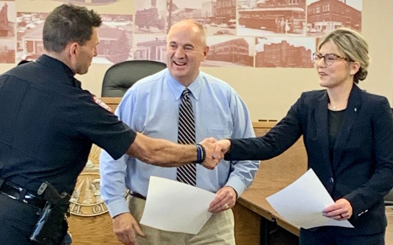 Bellefontaine Mayor Ben Stahler and the Bellefontaine Police Department’s Interim Chief Chris Marlow ushered in the BPD’s newest officer Wednesday afternoon.