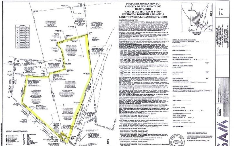 Christian Gillikin, of Bailey Cavalieri LLC, representing Hodson Greendefine Blue Jacket LLC, is requesting the annexation of a 200.827-acre tract (Logan County parcel #’s or portions thereof 15-077-00-00-037-000, 15-077-00-00-037.003, 16-077-00-00-012-000, 16-077-00-00-014-002, and 16-077-00-00-014.001) to the City of Bellefontaine. This property is located north of the intersection of Township Road 217 (Stockyard Road) and US 33, west of the C.C.C. & St. Louis Railroad (Conrail). The requested zoning for this tract is M-2 General Manufacturing District. The land is currently zoned B-1 and U-1 in Lake Township.