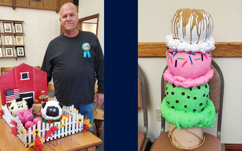 And the winner is… Adam Taylor representing the County Maintenance Staff, Adam’s charming “Farm Animal” pumpkins garnered an impressive $89.95, earning him a $25 gift card to Flying Pepper and the coveted bragging rights for the year.