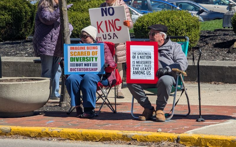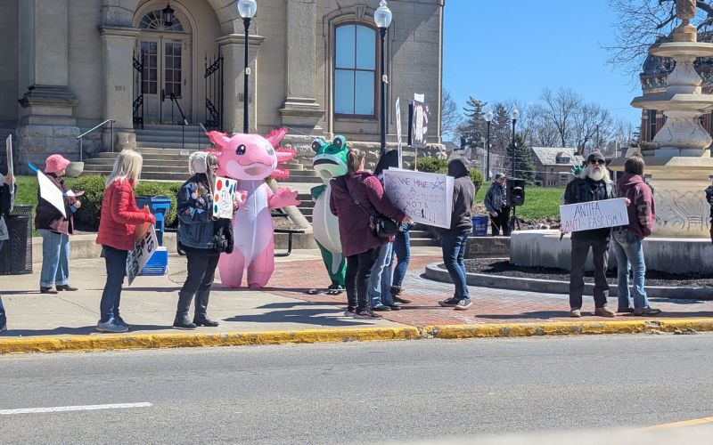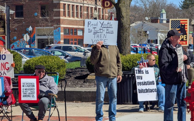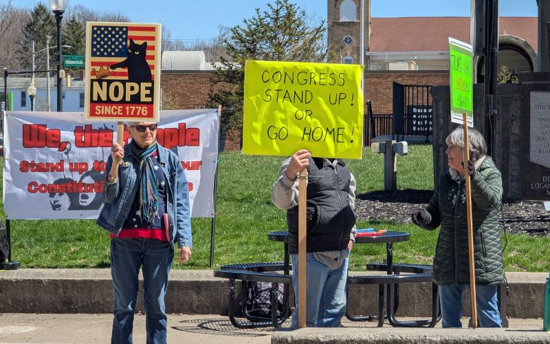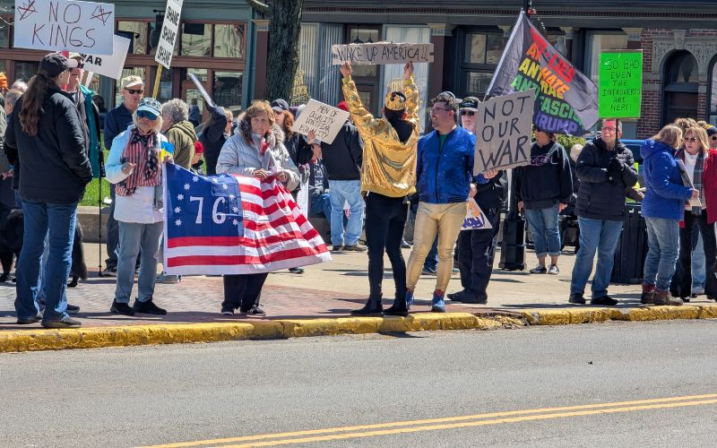 Several dozen people gathered in downtown Bellefontaine Saturday afternoon as part of nationwide “No Kings” protests.