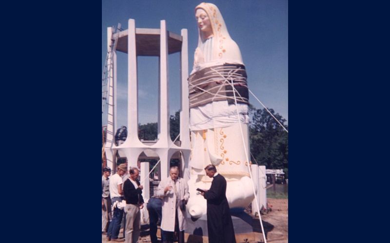 The Our Lady of Fatima Shrine at Russells Point, Ohio was one of the tallest statues of the Virgin Mary in the United States. Dedicated in August 1964, the 43’ tall monument included a rotating 19’-6” fiberglass statue on a concrete pedestal with fountains, music, and lighting. It was damaged beyond repair by the March 2024 tornado prior to a planned 60th anniversary celebration. The shrine property is located at 261 Chase Ave., Russells Point, Ohio.