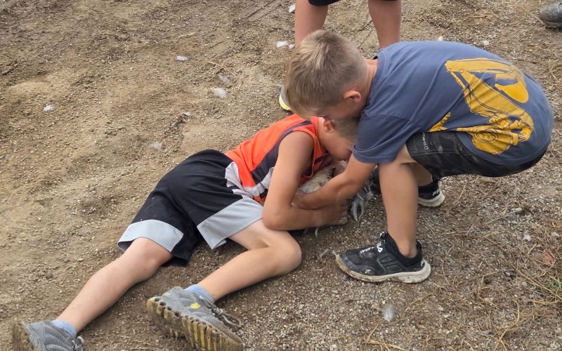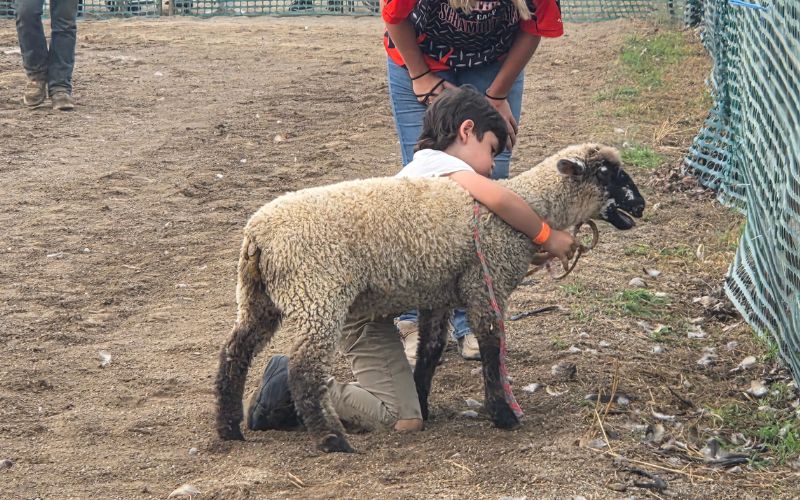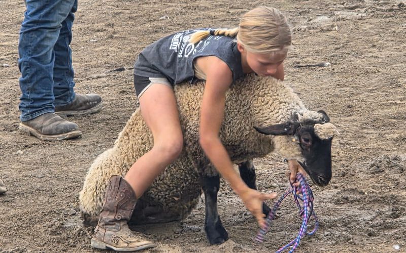 The second event, the sheep scramble, sees five sheep let loose in the arena—the object is to wrangle and put a halter on the sheep.