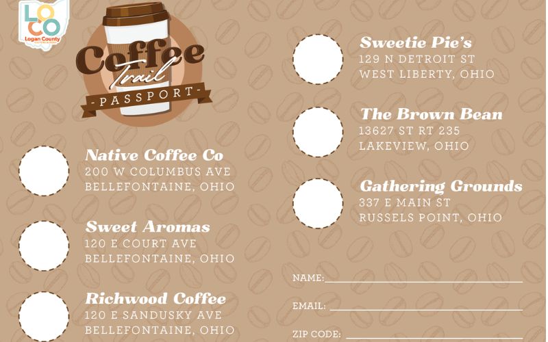 Pick up your passport at the Logan County Vistors Bureau or the participating coffee shops, collect a stamp at each coffee shop, and then turn in your passport to the Logan County Visitors Bureau for a prize.