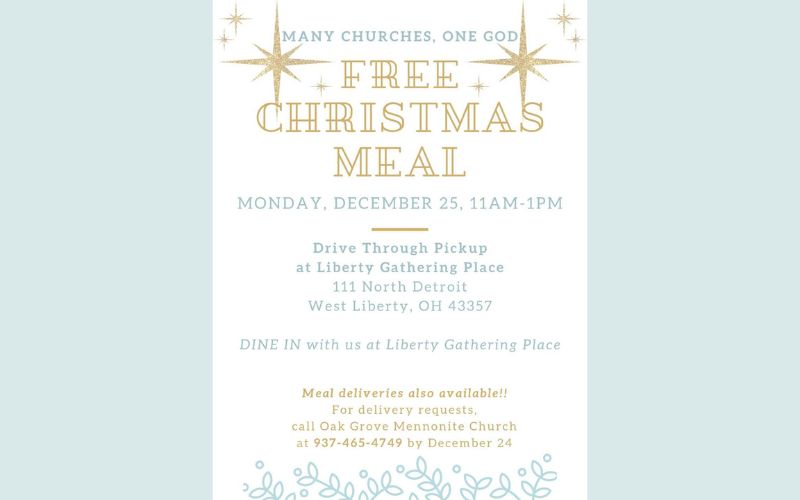 If you would like a meal delivered, you are asked to please contact the Oak Grove Mennonite Church at (937) 465-4749, no later than Christmas Eve.