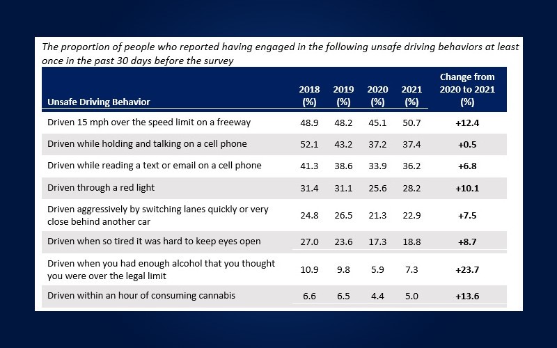 According to new survey data from the AAA Foundation for Traffic Safety, this is a reversal in the steady declines in these dangerous driving behaviors in the three years from 2018 through 2020.
