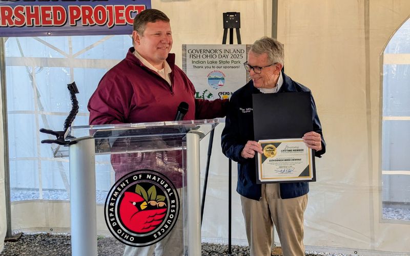 As a token of appreciation for the Governor’s continued support and advocacy, Wickersham presented Governor DeWine with a lifetime membership to the Indian Lake Watershed Project.