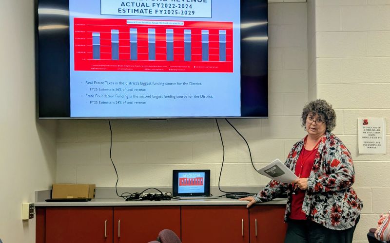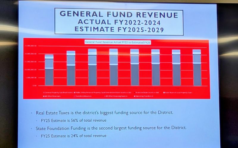She went on to report that 56% of the total revenue from the district is from real estate taxes, while 24% is state foundation funding.