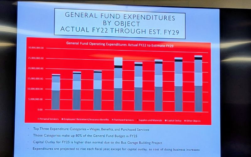 Reprogle gave a short PowerPoint showing that wages are the top expenditure, followed by benefits and purchased services, which include 80% of the budget.