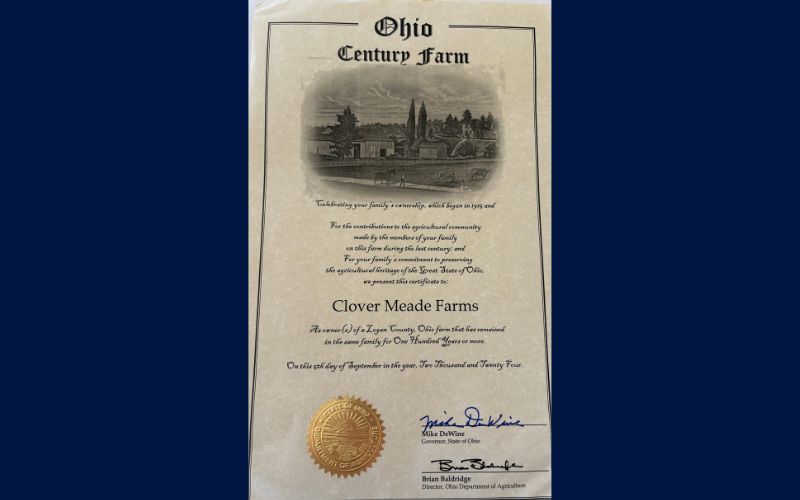 Don King’s family farm, Clover Meade Farms, in Bellefontaine has recently been added to Ohio’s prestigious Century Farms list, recognizing farms that have been in continuous family ownership for 100 years or more.