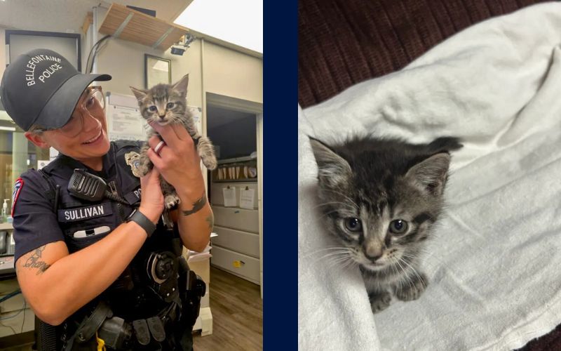 Rescuers showed the crew that was leaving on the emergency call the rescued kitten. (Video credit Ryan Shields)