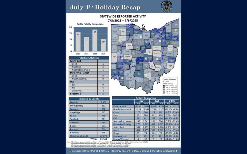 The Ohio State Highway Patrol is reporting 10 people lost their lives in 10 traffic crashes during the July Fourth reporting period, which began Thursday, July 3, at midnight and ended Sunday, July 6, at 11:59 pm.