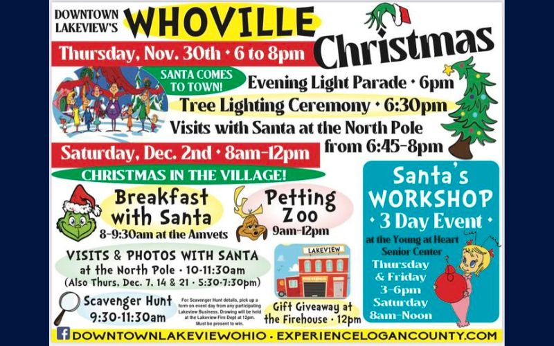 The 2023 Lakeview Whoville Christmas Light Parade and Tree Lighting Ceremony will be held on Thursday, November 30th from 6-8 PM.