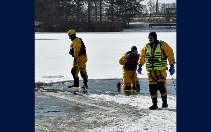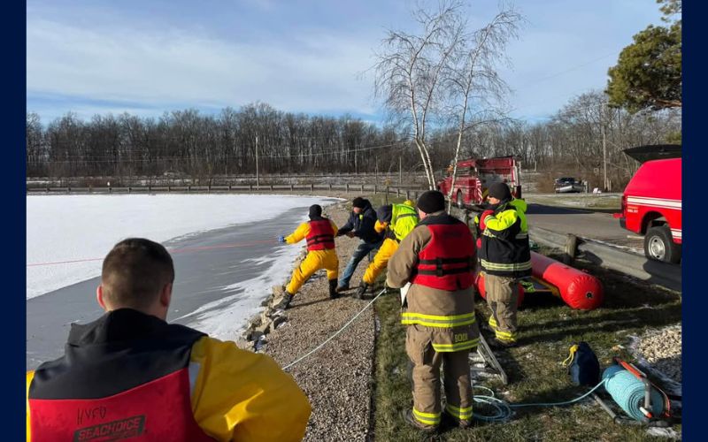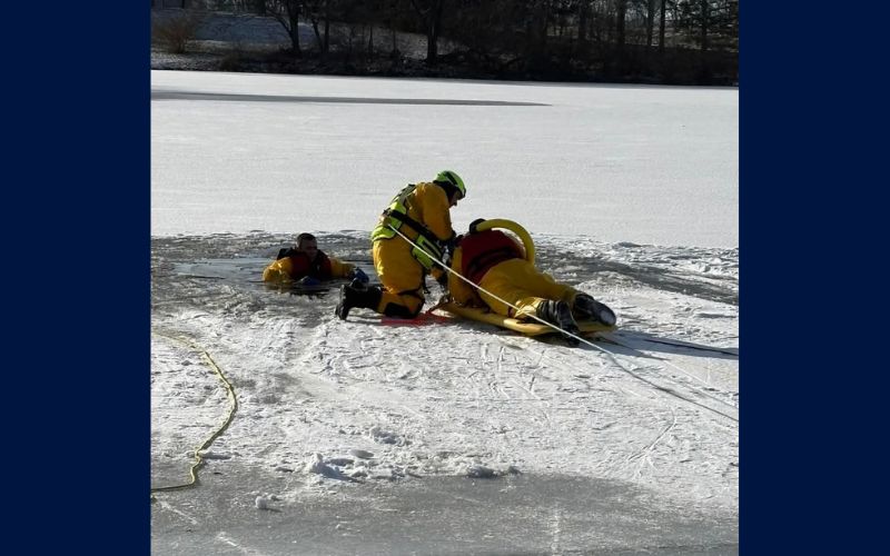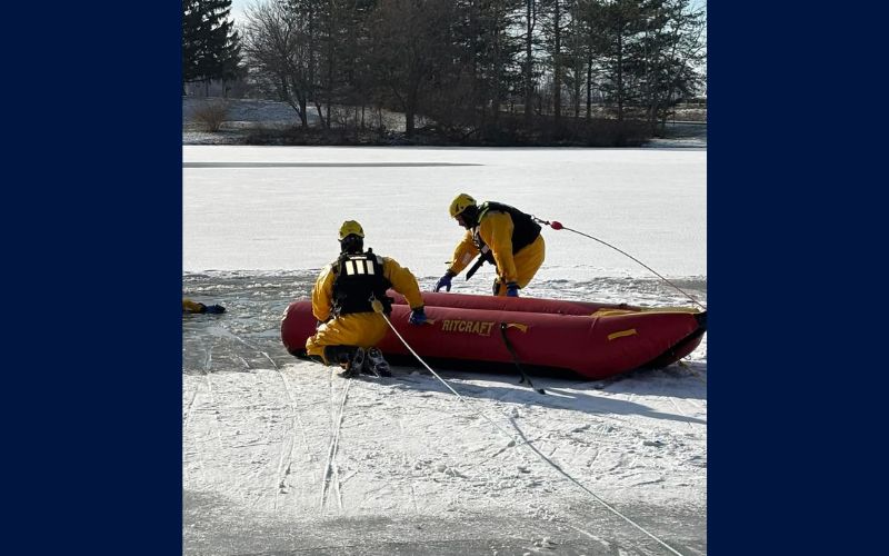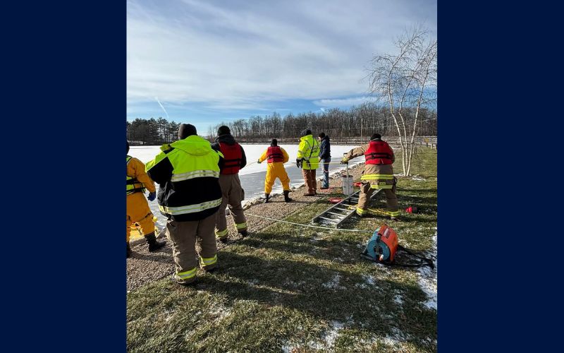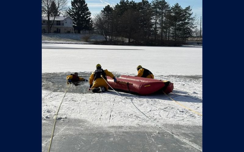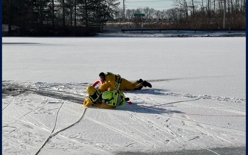 At Bell Pond in Huntsville on Saturday morning, Huntsville Fire & EMS trained with members from Bellefontaine Fire Department, Indian Lake EMS Joint Ambulance District, DeGraff Volunteer Fire Department, and Richland Township Volunteer Fire Department on Ice Rescue operations.