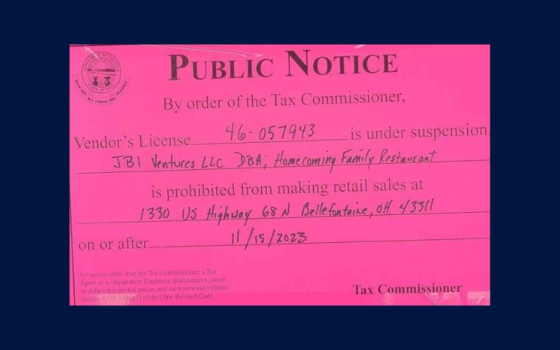 According to the Ohio Department of Taxation, on Wednesday JBI Ventures LLC doing business as the Homecoming Family Restaurant in Bellefontaine was prohibited from making retail sales due to failure to pay Ohio sales tax.