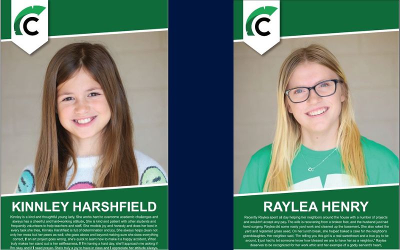 – Calvary Christian School (4th-8th grade) – Kinnley Harshfield was chosen for her determination, kindness, and willingness to help others. Kinnley overcomes academic challenges with a cheerful attitude and volunteers to help teachers and staff. Her selflessness, joy, and honesty set a great example for her peers.