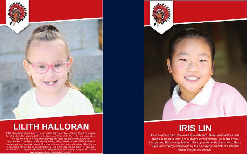 – Bellefontaine Intermediate – Iris Lin was selected for her hard work, consistent participation, and kind nature. Iris is always striving for excellence and never hesitates to encourage her classmates. Her willingness to help others and her positive leadership qualities make her an outstanding Chieftain.
