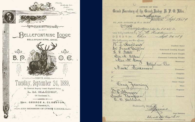 The B.P.O.E. organized Bellefontaine Lodge No. 132 on September 24, 1889, with sixteen members, being the 132nd chartered in the country, and 21st in Ohio. Their original meeting rooms were on the second floor of the Opera Block.