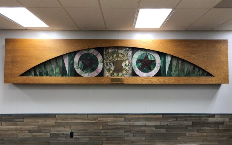 Early members did research to find an animal after which to name their organization. In natural history records, the elk was “fleet of foot, timid of wrongdoing, keen of perception, avoiding all combat, but quick to run to the defense of the young, the helpless and the weak”, and appealed to what the group wanted to stand for. The Elks emblem was adopted in 1908 and consists of “a combination of a dial, showing the hour 11, with a white face and red Roman numerals, circumscribed by a blue circle, containing the initials B.P.O.E., on which the dial shall rest on the elk’s head and antlers, which shall be surmounted by a red five-point star.”