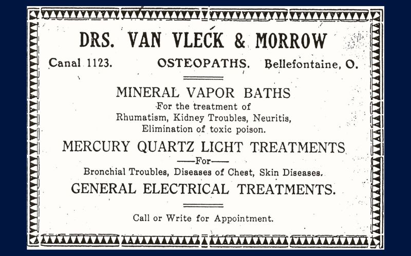 Guy H. Swan was the son of Edwin A. Swan, M.D. who practiced in Bellefontaine for over twenty years. After graduating from the Detroit College of Medicine in 1903, Dr. Guy H. Swan opened his practice on W. Chillicothe Ave. Seven years later, he opened his bungalow-type office on N. Detroit St. along with Edward V.M. Thompson DDS. They treated patients at this location until 1927 when the office was purchased by Dr. Ralph H. Van Vleck who had practiced in Bellefontaine for several years. At that time, Dr. Thompson moved his office to the Empire Block, and Dr. Swan moved to New Jersey where he was on staff at the Paul Kimble Hospital in Lakewood, New Jersey. In 1932, Dr. John W. Morrow went into partnership with Dr. Van Vleck.