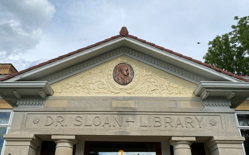 The Dr. Sloan library was dedicated on September 8, 1914, Earl Sloan’s birthday. The library is constructed of buff brick and gray Bedford limestone with a red tile roof. A bronze bust of Dr. Sloan adorns the front of the library. The upper level has five rooms, the main reading room, children’s reading room, book room, reference room, and trustee’s room. The basement features a meeting room, community room and fully equipped kitchen.