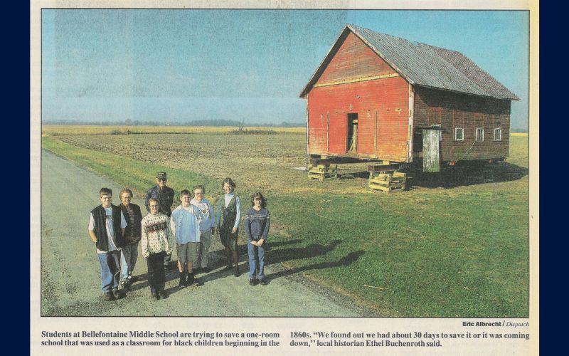 In 1999, Ethel Buchenroth, of Huntsville, visited the former school while doing research on the Underground Railroad in Logan County. The next year, the property owner contacted Buchenroth and told her he planned to tear it down and construct a new outbuilding in its place. Buchenroth said she “hit the panic button” and contacted Bellefontaine Middle School enrichment teacher Kris Swisher, about saving the building. The year before, Swisher’s class had dedicated themselves to saving the Holland Theatre, which led to the formation of the Logan County Landmark Preservation Society Inc.