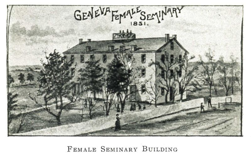 In the spring of 1850, the first legal charter was secured, and one year later, the first official catalogue was issued. That same year, the Geneva Female Seminary building was opened. Misses Isabella and Elizabeth Schultz, of Edinburgh, Scotland, accomplished teachers of French, German, art, and music, became instructors in 1854.